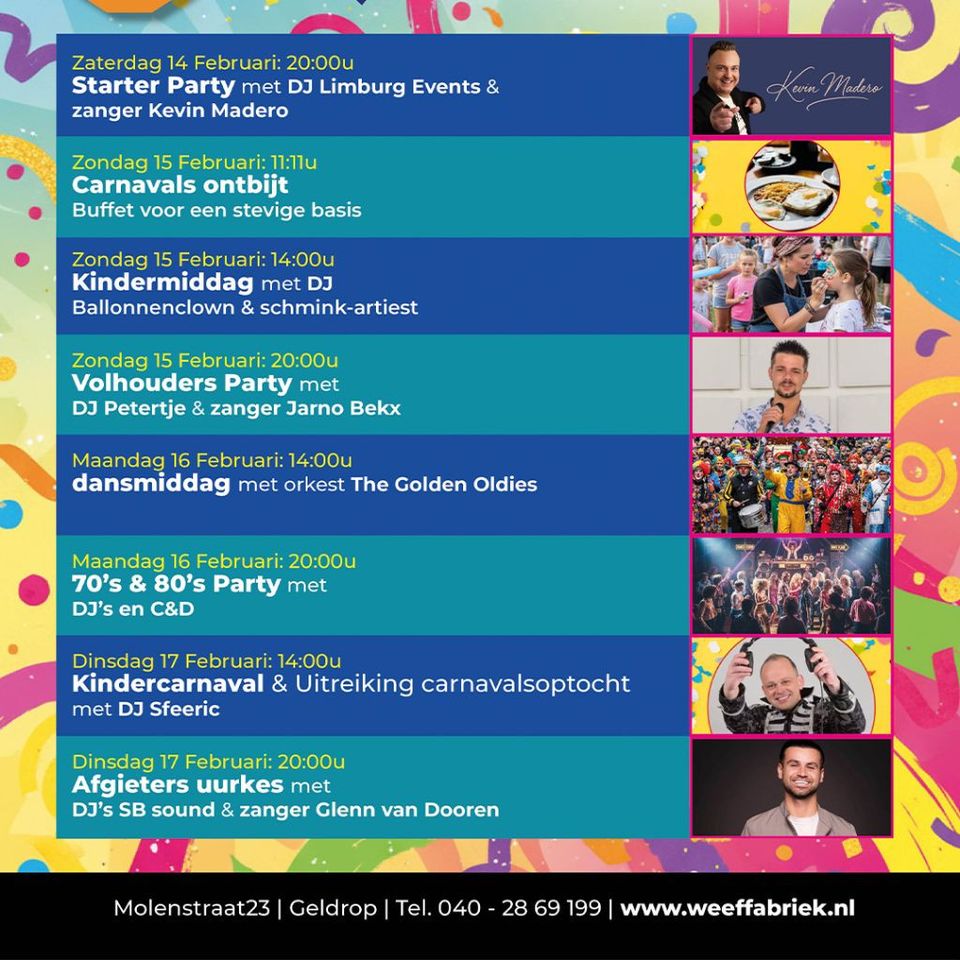 Zaterdag 14 Februari: 20:00u Starter Party met DJ Limburg Events & zanger Kevin Madero Zondag 15 Februari: 14:00u Kindermiddag met DJ Ballonnenclown & schmink-artiest Zondag 15 Februari: 20:00u Volhouders Party met DJ Petertje & zanger Jarno Bekx Maandag 16 Februari: 14:00u dansmiddag met orkest The Golden Oldies